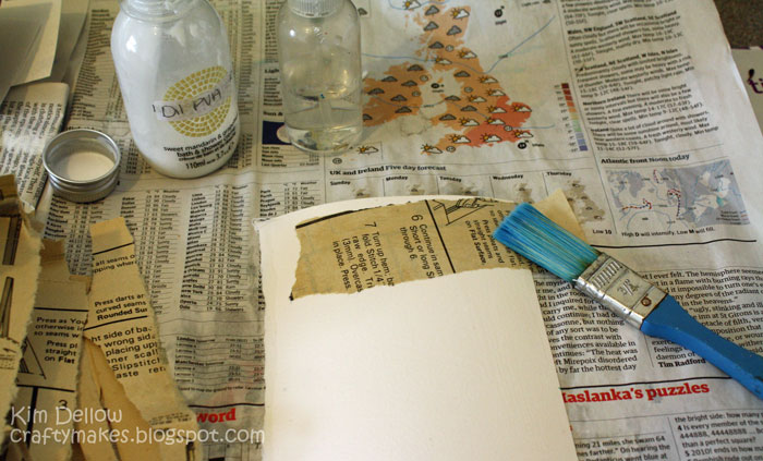I have a dedicated glue brush for all my glue work, a little nylon bristle paint brush. You want to dilute some PVA to the consistency of single cream, I usually store mine in an old bottle. You might also want to have a mini-bottle of water to hand and to work on a plastic sheet.